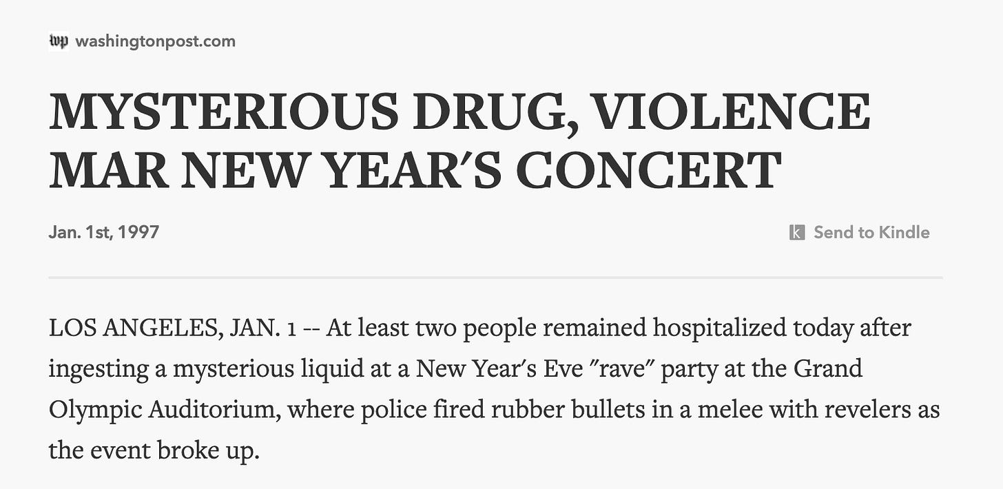 His extended account here in Insomniac magazine is much more colorful than the version included in the book, and the event became news reported by the national media, part of a trend of alarmist coverage that ultimately culminated in then Senator Joe Biden championing the 2003 RAVE Act (Illicit Drug Anti-Proliferation Act).