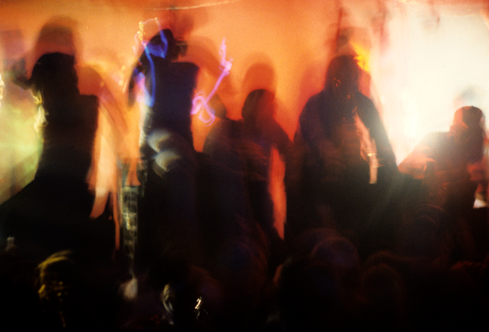 In one of my favorite images (included above), Tullberg employs multiple exposures to capture the sort of ecstatic hands-in-the-air dancing familiar to pretty much everyone who’s ever gotten lost in the rave sauce. The central figure is having a moment, the overlay of multiple, strobe-lit exposures allows us to get a sense of how he moved. The strobe flashes reveal in one frame two faces peeking directly at the lens, in the next frame looking away, a reminder of the ways in which dancers steal looks at each other but never for much longer than the blink of a strobe. These surreptitious glances are part of the social experience, and it wasn’t until I saw them in this image that I realized how often we all steal glimpses of each other when dancing.