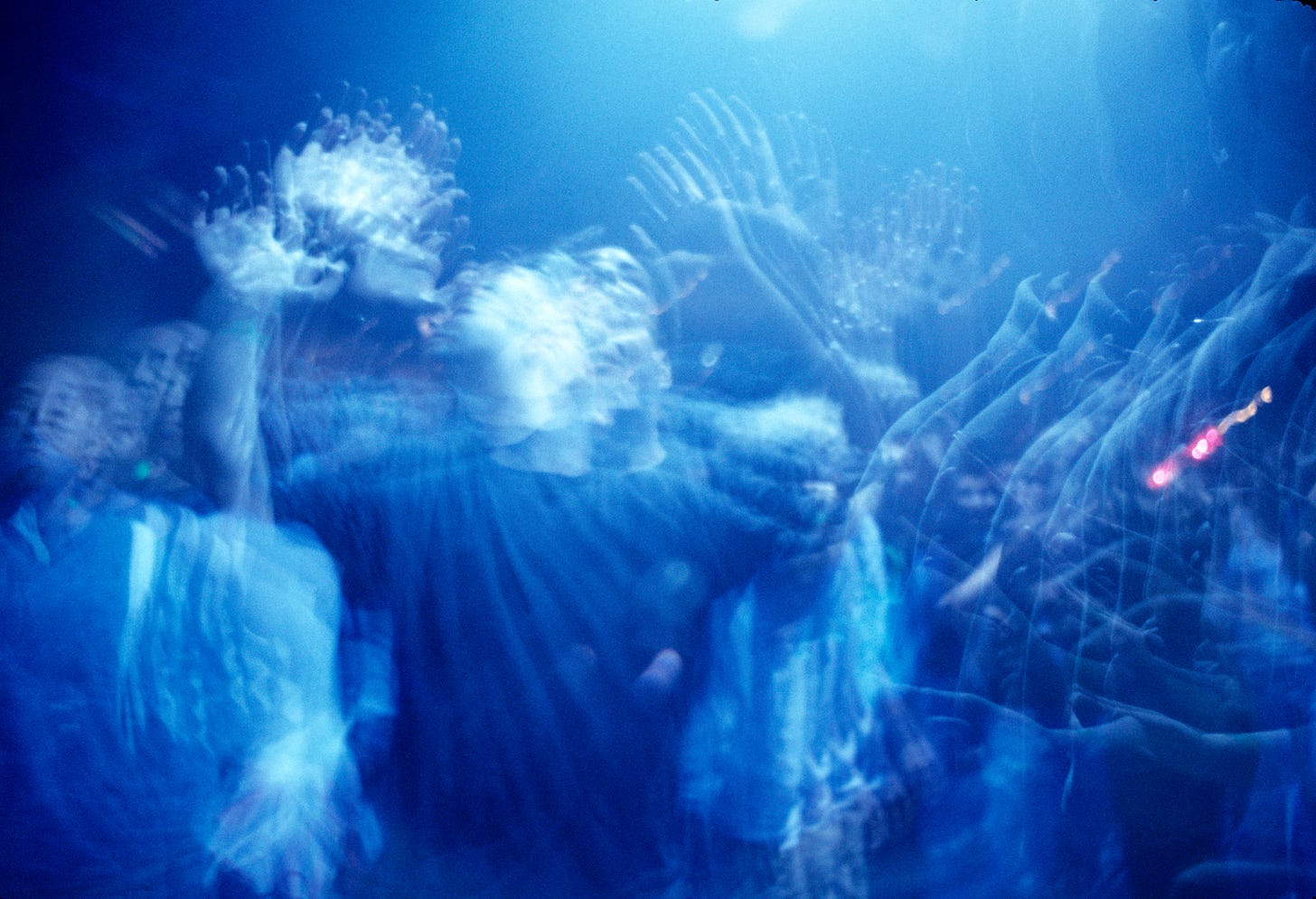 For me, Tullberg’s strongest images are those in which he tosses the photographic rules of exposure and clarity in favor of images that, like the image above, capture the ways in which light, movement, and mind-altering substances play tricks on our senses. These distortions of reality feel more true and more representative of what it feels like to be a participant in a rave than a straight or undistorted photo of the same scene could ever convey. The silhouettes above -- from a Sugar Beats party in 1996 -- were captured in what Tullberg tells us were sauna-like conditions in which condensate of sweat dripped from the ceiling.