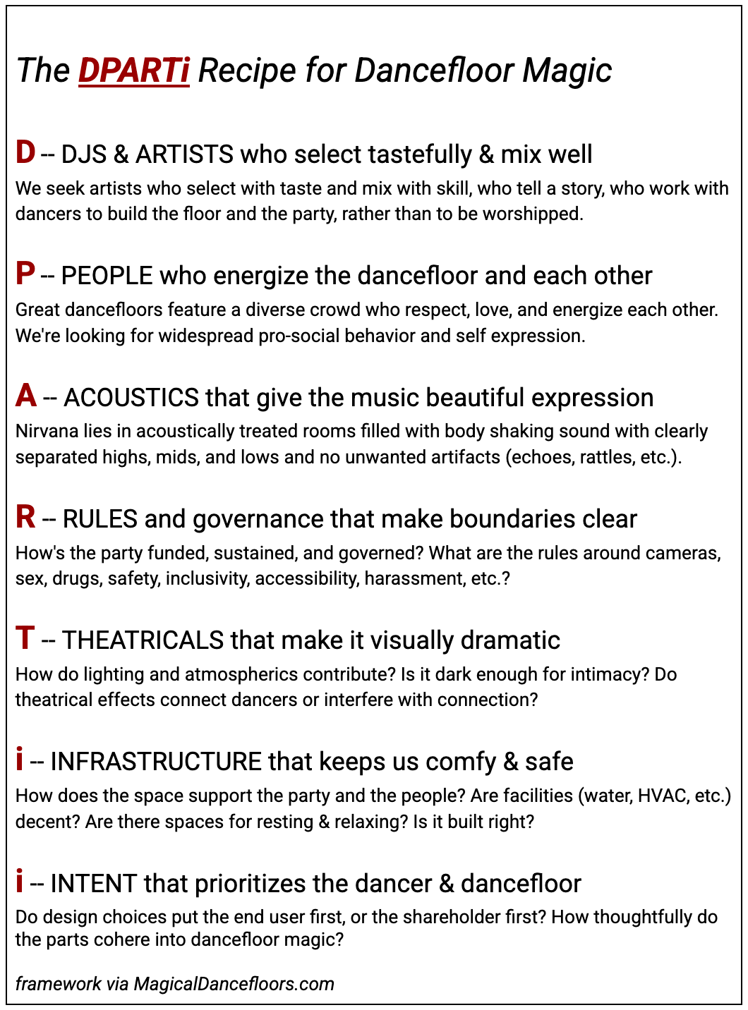 I will confess that our dancefloor isn’t magical yet. I’d give us a 6 or 7 on my 10-point scale. Our shortfalls are numerous. Using the DPARTi framework, our shortfalls are especially pronounced in three areas: