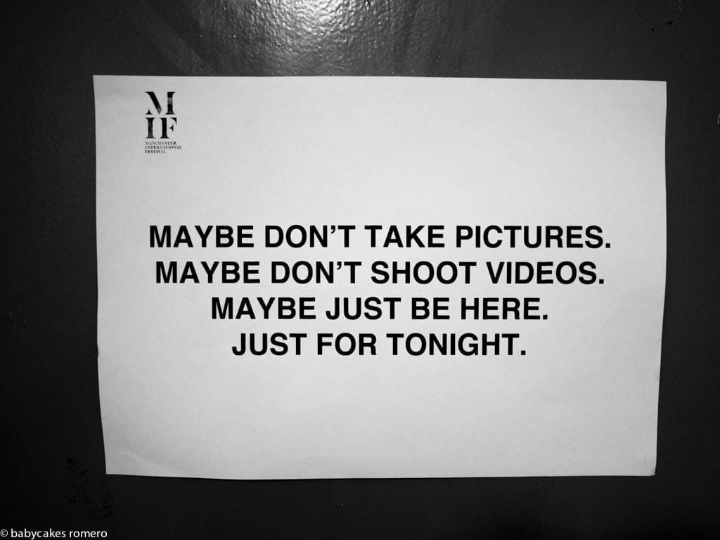 Despacio’s next event is rumored to be a standalone event in NYC. I believe that this event should be announced as a “no photos” event, that cameras should be stickered on entry, and that security should talk to and/or remove folks who break this simple rule. Doing so would be consistent with the founding ethos of Despacio, where the first shows had a sign like the one pictured here that encouraged people to stay off their phones and simply enjoy the moment: