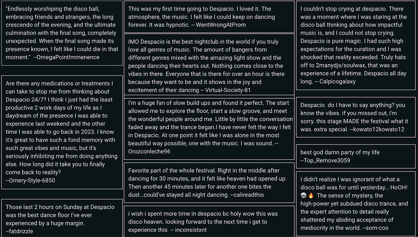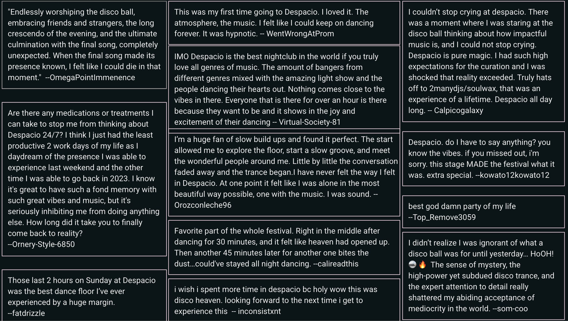 Hundreds of folks took to the internet after the event to talk about how the event had changed their lives. The Despacio Discord (discord.gg/despacio) gained a couple hundred new folks, all of them eager to discuss and process the experience.