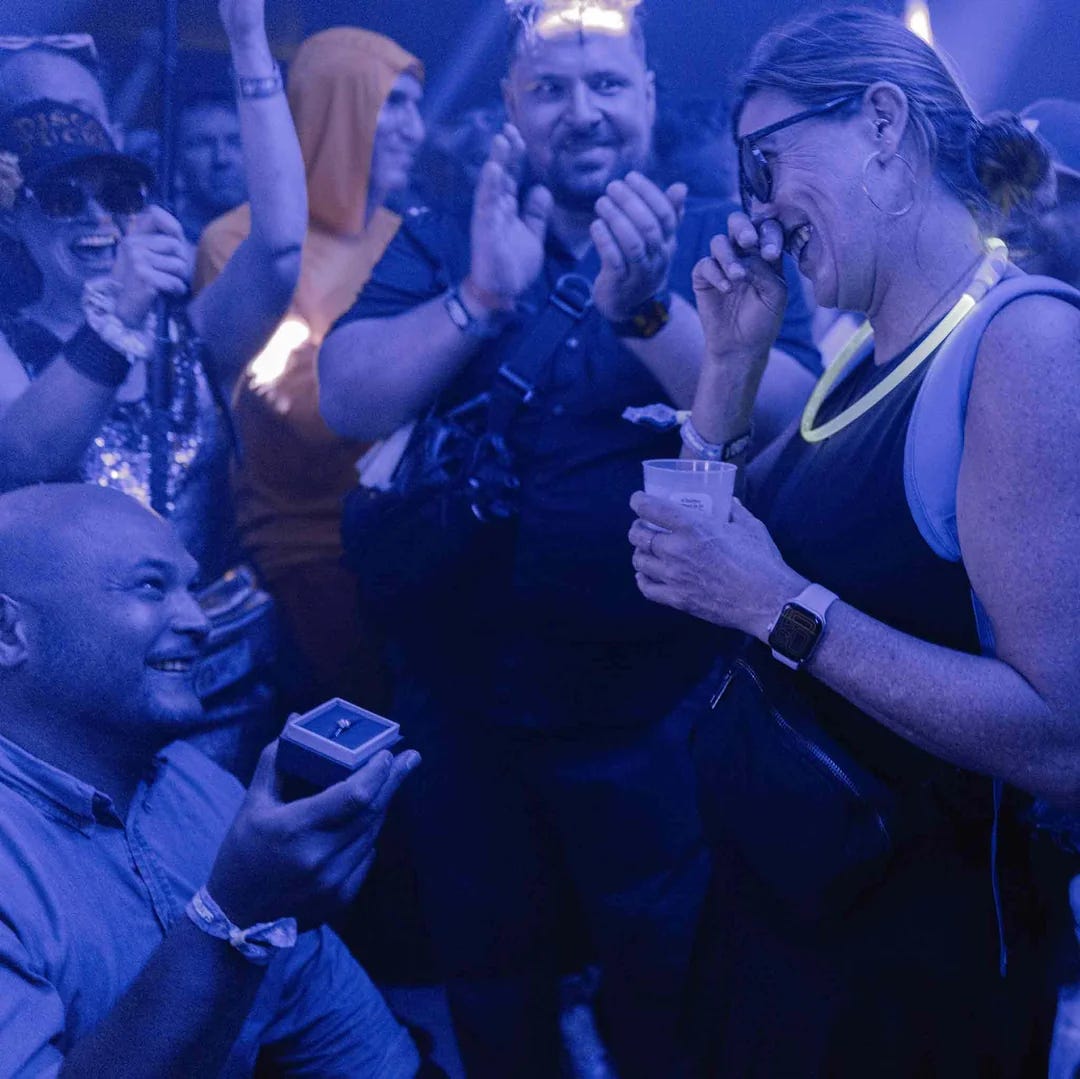 The proposal. At about 5pm on that first day, a group of friends had been told they were to meet under the disco ball, but weren’t told exactly why. Once the group had assembled, a man dropped to one knee and asked his girlfriend to marry him. The song playing at the time was Ba Ba Go, Go by Topo, a funky, 1983 Italo-disco track with strange cat meows, a wonderful bassline, and the fitting lyrics, “I love you.” A cheer went up in the crowd when the proposal was accepted, and the DJs were quite confused, because they’d played the song several times at prior Despacios and it had never inspired such cheering.