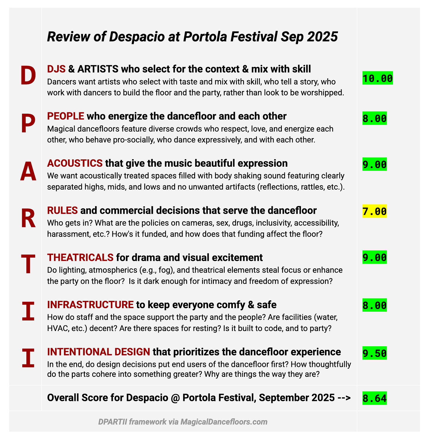 But unless Despacio takes a stand, it will continue to see its highest energy moments undermined by tourists stepping out of the dance to take souvenirs and keepsakes. This is not what I want to see happen to my favorite dance party on earth, and yet it’s already happening. In the scorecard below, Despacio is getting a “RULES” score of 7 for the lack of a phone policy, and the PEOPLE of Portola are getting a (rather generous, considering the level of phone use) 8 for forgetting that the dancefloor is for dancing. I can see both of these scores trending lower over time if the organizers don’t put into place a more muscular set of anti-phone policies.